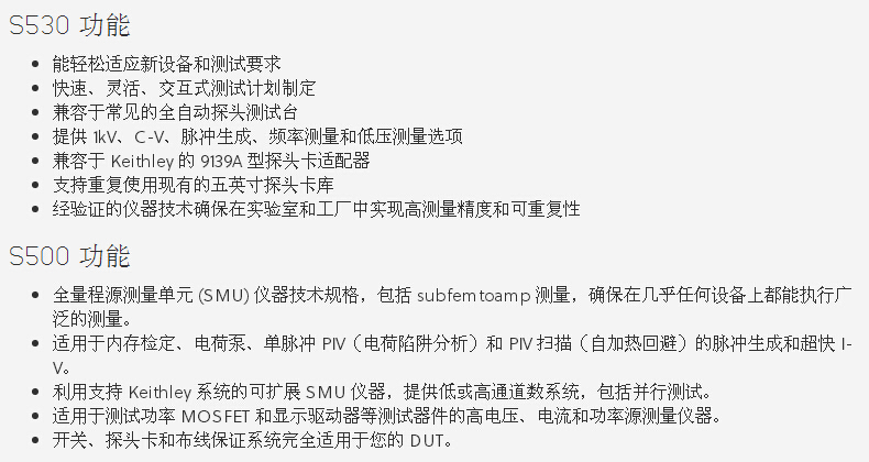 - 通過自動探頭測試臺實現(xiàn)精密高速測量 S530 參數(shù)化測試系統(tǒng)適用于必須操作各種設(shè)備和技術(shù)的生產(chǎn)和實驗室環(huán)境,提供業(yè)界領(lǐng)先的測試計劃靈活性、自動化、探頭測試臺集成以及測試數(shù)據(jù)管理功能。Keithley 擁有超過 30 年的專業(yè)經(jīng)驗,針對這些測試解決方案的設(shè)計向全世界的客戶提供各種標(biāo)準(zhǔn)和自定義參數(shù)化測試儀。 S500 集成式測試系統(tǒng)是高度可配置的、基于儀器的系統(tǒng),適用于器件、晶片或暗盒級半導(dǎo)體檢定。S500 集成式測試系統(tǒng)基于我們經(jīng)過驗證的儀器,提供創(chuàng)新的測量功能和系統(tǒng)靈活性,并且根據(jù)您的需求可進行擴展。獨有的測量能力結(jié)合強大而靈活的自動化檢定套件 (ACS) 軟件,提供市場上其他同類系統(tǒng)無法提供的廣泛應(yīng)用和功能。
