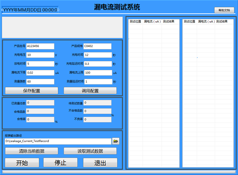 3)軟件主要功能:實(shí)現(xiàn)開關(guān)自動(dòng)切換,自動(dòng)對電容進(jìn)行充放電,以及漏電流測試,自動(dòng)將產(chǎn)品批號,產(chǎn)品規(guī)格以及測試數(shù)據(jù)寫入測試報(bào)表中(excel或txt文本文件),實(shí)現(xiàn)測試記錄可追溯,測試參數(shù)設(shè)置保存,調(diào)用,結(jié)果自動(dòng)對比PASS/Fail。如需更多功能可定制。