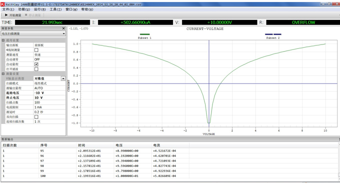 - 采用吉時利2400、2401、2410、2420等系列數(shù)字源表作為電流(壓)源輸出,通過恒流、恒壓、電流掃描、電壓掃描不同的模式,對兩端器件進行電壓、電流、電阻的測量和數(shù)據(jù)采集,并根據(jù)參數(shù)設(shè)置顯示為IT、VT、IV、VI曲線。