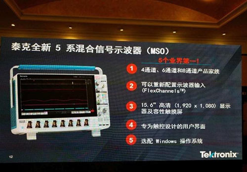 全球領(lǐng)先的測(cè)量解決方案提供商泰克科技公司在北京正式發(fā)布了,基于全新平臺(tái)推出5系列混合信號(hào)示波器(MSO)。這款產(chǎn)品也創(chuàng)造了業(yè)界的5個(gè)第一,包括:1.四通道、六通道和八通道產(chǎn)品家族;2.可以重新配置示波器輸入(FlexChannel);3.15.6英寸容性觸控高清(1920 x 1080 px)顯示器;4.專為觸控設(shè)計(jì)的用戶界面;5.選配Windows操作系統(tǒng)。
