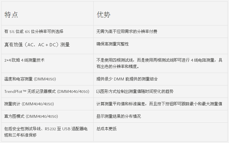 - 5? 位 DMM4020 和 6? 位 DMM4050 與 DMM4040 多功能臺(tái)式萬(wàn)用表具備全方位功能,可滿足工作臺(tái)上或系統(tǒng)中的最苛刻測(cè)量要求。這些數(shù)字萬(wàn)用表執(zhí)行的功能是您期望多功能 DMM 中具有的,包括測(cè)量電壓、電阻、電流和頻率。DMM4050 增加了溫度和電容功能,通用性更高。
