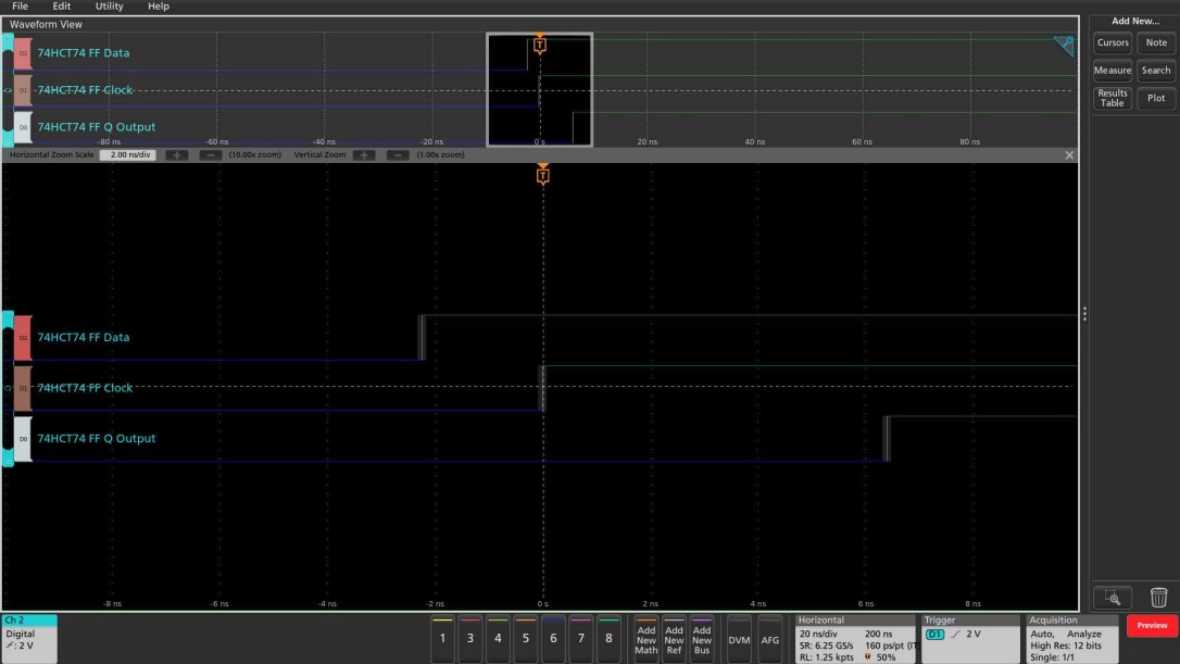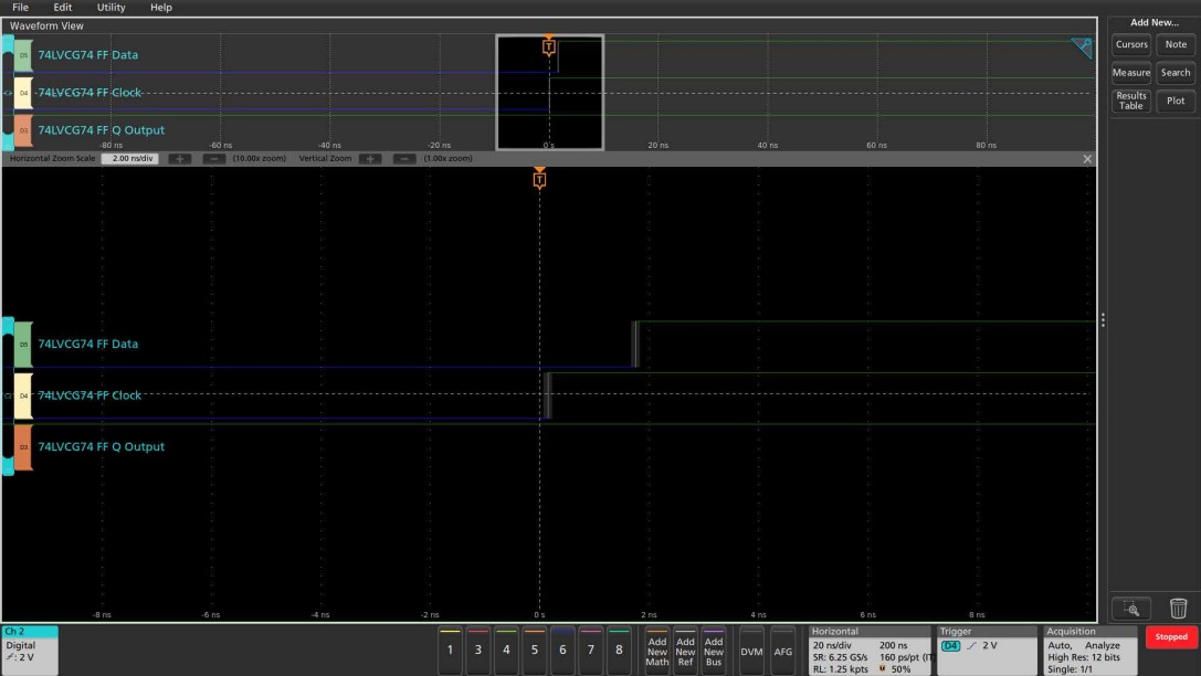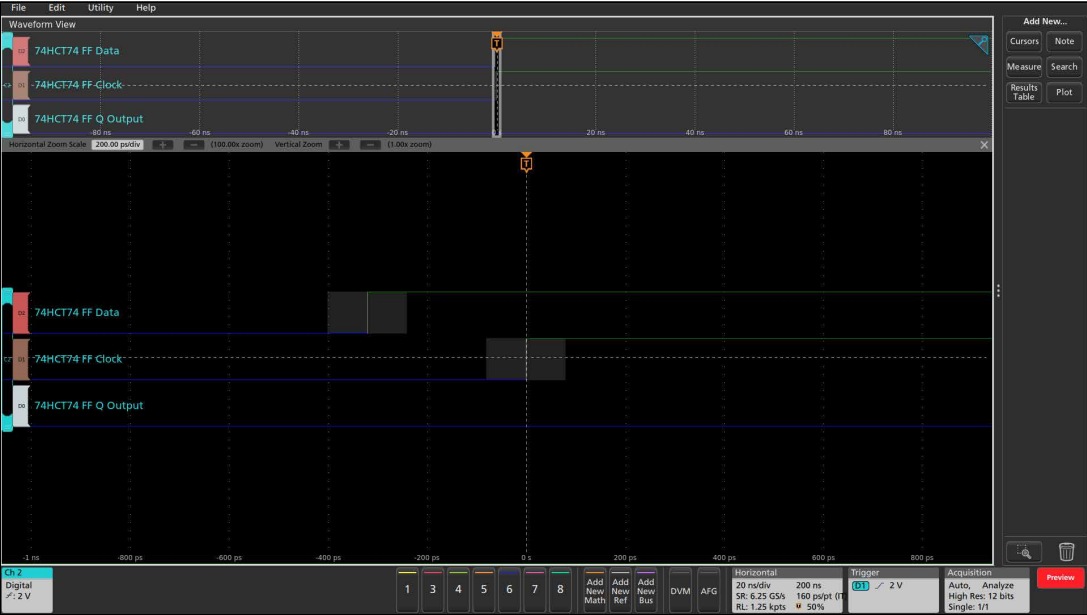 乍一看,如圖1所示,觸發(fā)器似乎按預(yù)期工作。數(shù)據(jù)信號在時鐘上升沿之前已經(jīng)穩(wěn)定了幾納秒,并且在時鐘邊沿之后保持穩(wěn)定了幾納秒。從時鐘邊沿到Q輸出的傳播延遲大約是6納秒。