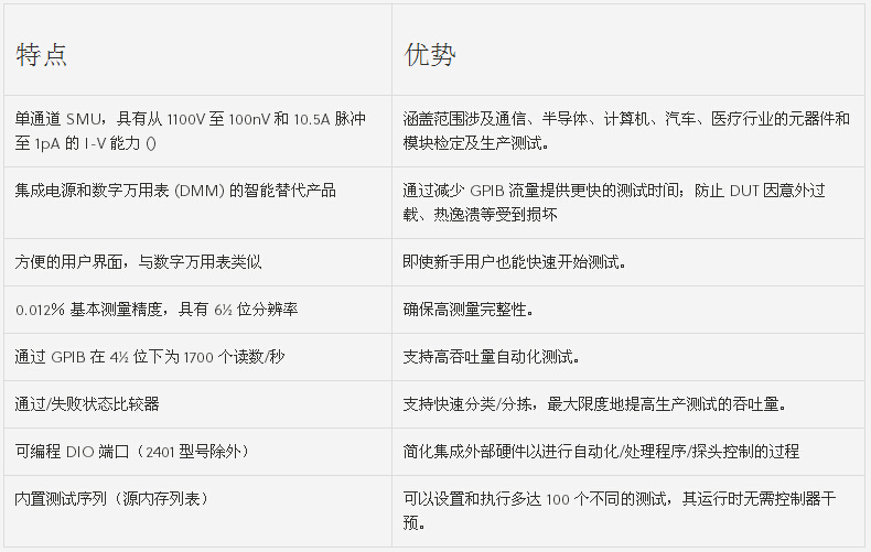 - 緊密耦合的精密源和測(cè)量 2400 系列 SourceMeter 源測(cè)量單元 (SMU) 儀器是業(yè)內(nèi)最初的單通道電壓/電流源和測(cè)量儀器。 每臺(tái) 2400 系列 SMU 儀器均與高度穩(wěn)定的直流電源以及真正的儀器級(jí) 6? 數(shù)字萬用表(測(cè)量范圍為 1100V 至 100nV 以及 10.5A 脈沖至 1pA)緊密連接在一起。 2400 系列的替代選擇包括用觸摸屏操作的 2400 圖形系列 SourceMeter SMU 儀器以及 2600B 系列單通道和雙通道 SMU 儀器。