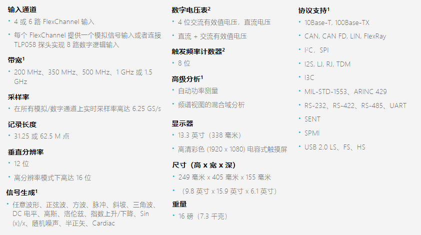 | 模擬帶寬 | 采樣率 | 記錄長(zhǎng)度 | 模擬通道 | 數(shù)字通道 |